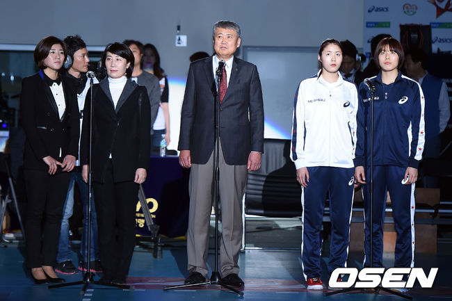 25일 오후 서울 장충체육관에서 열린 'NH농협 2014~2015 V-리그 올스타전' 경기에 앞서 1994 히로시마 아시안게임 금메달 리스트 장윤희와 이도희, KOVO 진준택 경기운영위원장, '2014 인천 아시안게임 금메달 리스트' 쌍둥이 자매 이재영(흥국생명)과 이다영(현대건설)이 함께하는 애국가 제창을 하고 있다.