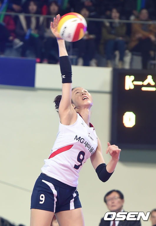 25일 오후 서울 장충체육관에서 열린 'NH농협 2014~2015 V-리그 올스타전' 스파이크 콘테스트에서 백목화가 서브를 하고 있다.