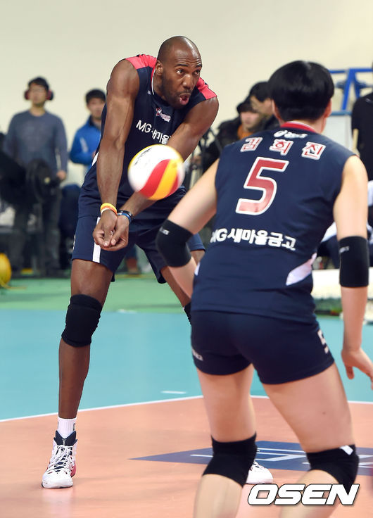 25일 오후 서울 장충체육관에서 열린 'NH농협 2014~2015 V-리그 올스타전' 1세트 V스타 시몬이 수비를 하고 있다.