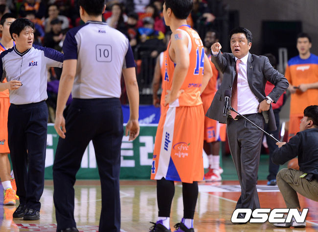 1쿼터 전자랜드 레더가 테크니컬 파울을 연달아 받으며 퇴장당하자 유도훈 감독이 판정에 불만을 나타내고 있다.