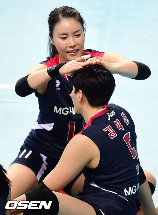 25일 오후 서울 장충체육관서 열린 NH농협 2014~2015 V-리그 올스타전 2세트 김사니가 김희진의 머리를 묶어주고 있다.