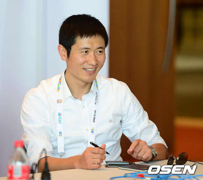 울리 슈틸리케 감독이 이끄는 한국 축구대표팀이 이라크와의 2015 아시안컵 4강전에 대비해 25일 오후 호주 시드니 스타디움 오스트레일리아서 훈련을 가질 예정인 가운데 기자실에서 이영표 해설위원이 환하게 미소짓고 있다.