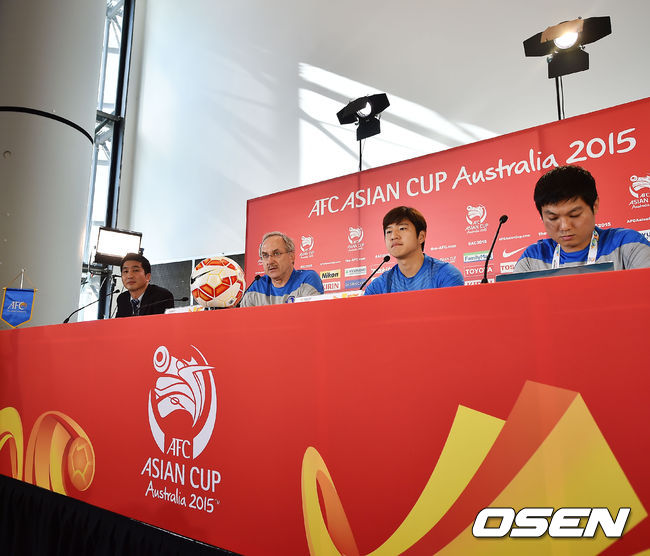 울리 슈틸리케 감독이 이끄는 한국 축구대표팀이 이라크와의 2015 아시안컵 4강전에 대비해 24일 오후 호주 시드니 스타디움 오스트레일리아서 훈련을 가졌다. 훈련 전 기자회견이 열리고 있다. 이 날 한국 기자회견에는 슈틸리케 감독과 박주호가 참석했다.