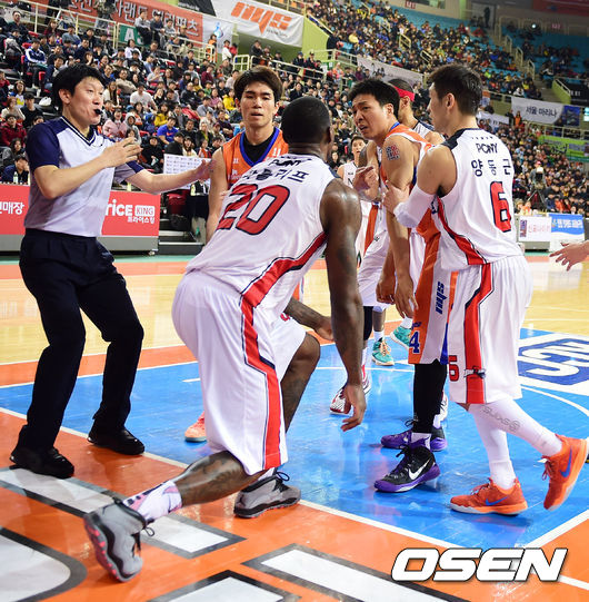 4쿼터 모비스 라틀리프와 전자랜드 이현호가 볼을 다투며 코트에 넘어지자 말다툼을 벌이고 있다.
