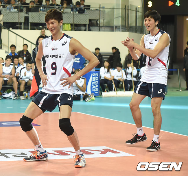 25일 오후 서울 장충체육관에서 열린 'NH농협 2014~2015 V-리그 올스타전' 류윤식이 득점을 올린 뒤 댄스를 선보이고 있다.