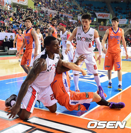 4쿼터 모비스 라틀리프와 전자랜드 이현호가 볼 다툼 과정에서 넘어지고 있다./jpnews@osen.co.kr