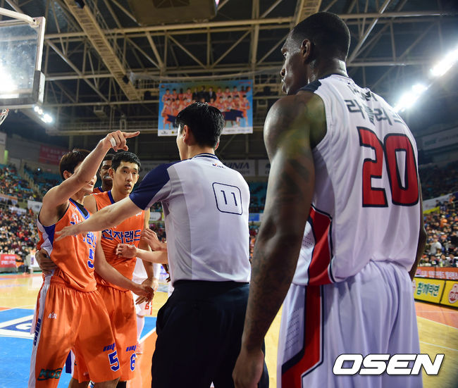 4쿼터 모비스 라틀리프가 전자랜드 이현호와 더블 파울을 당한뒤 정병국과 말싸움을 하고 있다./jpnews@osen.co.kr