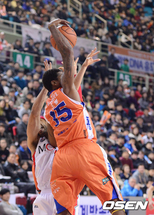 3쿼터 전자랜드 포웰과 모비스 문태영이 리바운드를 다투고 있다./jpnews@osen.co.kr