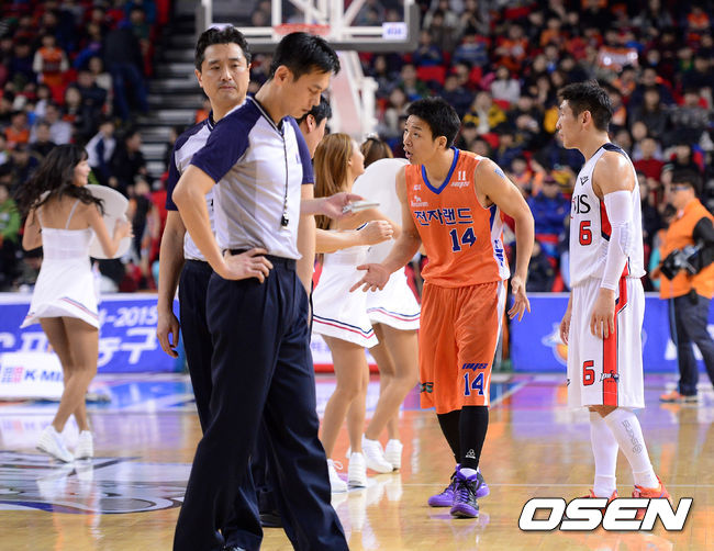 4쿼터 전자랜드 이현호가 모비스 라틀리프와 더블 파울을 받으며 심판에 불만을 나타내고 있다./jpnews@osen.co.kr
