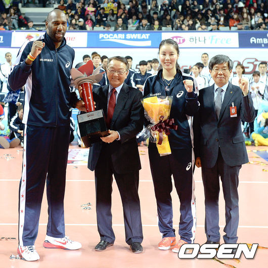 우승을 거둔 V-스타 시몬과 김사니가 우승 트로피를 들고 포토타임을 갖고 있다. /youngrae@osen.co.kr