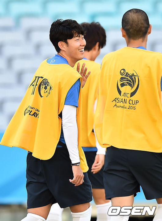 울리 슈틸리케 감독이 이끄는 한국 축구대표팀이 이라크와의 2015 아시안컵 4강전에 대비해 25일 오후 호주 시드니 스타디움 오스트레일리아서 훈련을 가졌다. 그라운드 위에서 손흥민이 환하게 웃고 있다.