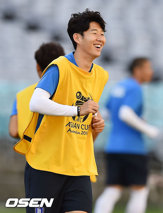 울리 슈틸리케 감독이 이끄는 한국 축구대표팀이 이라크와의 2015 아시안컵 4강전에 대비해 25일 오후 호주 시드니 스타디움 오스트레일리아서 훈련을 가졌다. 그라운드 위에서 손흥민이 환하게 웃고 있다.