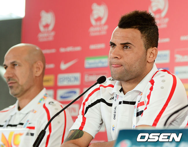 울리 슈틸리케 감독이 이끄는 한국 축구대표팀이 이라크와의 2015 아시안컵 4강전에 대비해 25일 오후 호주 시드니 스타디움 오스트레일리아서 훈련을 가졌다. 한국과 맞붙는 이라크가 기자회견을 갖고 있다. 이 자리에는 라디 셰나이실 이라크 감독과 왈리드 살림이 참석했다. 이라크 왈리드 살림이 기자회견 중 고심하고 있다.