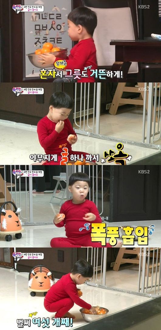 만세는 25일 오후 방송된 KBS 2TV 예능프로그램 ‘해피선데이-슈퍼맨이 돌아왔다(이하 ’슈퍼맨‘)’에서 아빠가 해준 떡볶이에 귤 6개를 먹어 눈길을 끌었다.