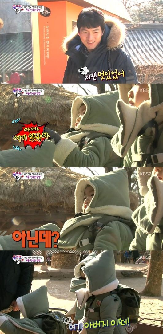이날 방송에서 송일국은 삼둥이를 데리고 민속촌을 찾았다. 민속촌에 있는 10년 전 송일국의 사진을 본 삼둥이는 “아빠 없어”라며 못 알아봤고 송일국은 “여기 있잖아”라며 다시 자신의 사진을 가리켰다.