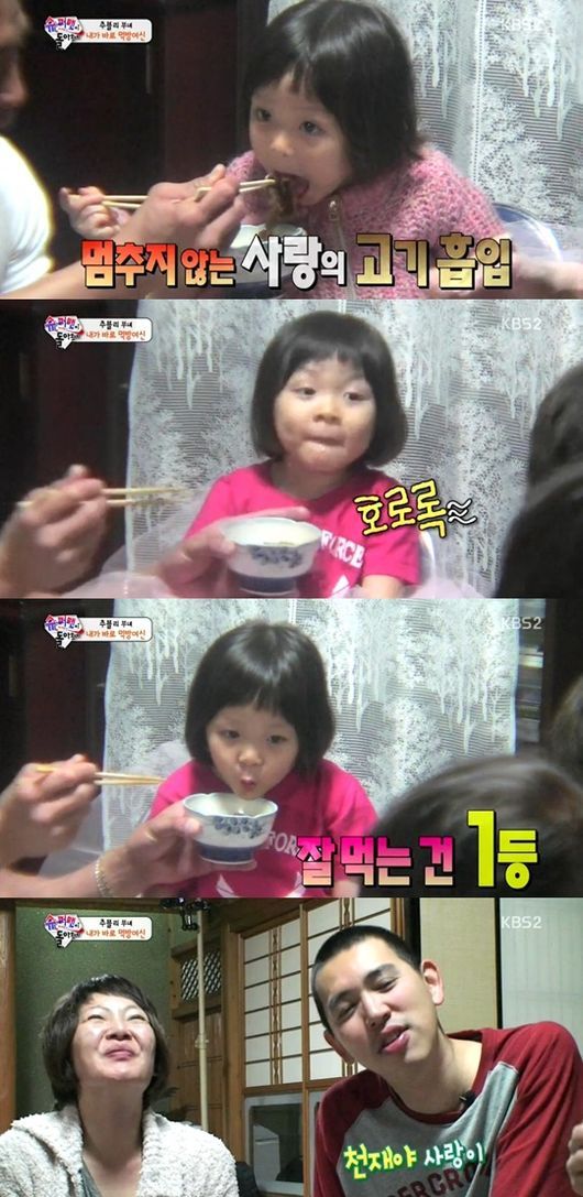 추사랑은 25일 오후 방송된 KBS 2TV 예능프로그램 ‘해피선데이-슈퍼맨이 돌아왔다(이하 ’슈퍼맨‘)’에서 고기를 폭풍흡입, 눈길을 끌었다.