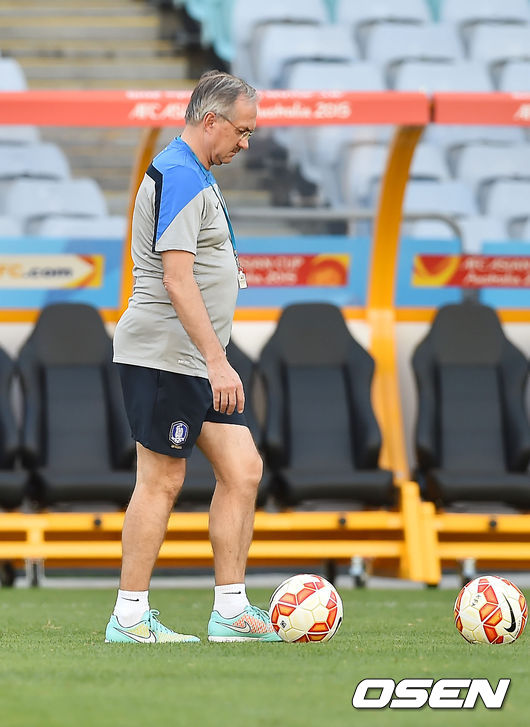 울리 슈틸리케 감독이 이끄는 한국 축구대표팀이 이라크와의 2015 아시안컵 4강전에 대비해 25일 오후 호주 시드니 스타디움 오스트레일리아서 훈련을 가졌다. 그라운드 위에서 슈틸리케 감독이 공을 차고 있다.