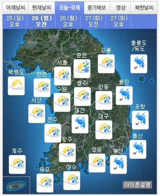 26일 월요일인 내일 아침까지 남부지방에는 10~30, 서울 등 중부지방은 5~10mm의 비가 예상된다.
