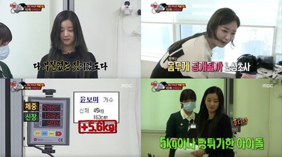 신체검사를 통해 공개된 윤보미의 몸무게는 50.6kg. 윤보미는 프로필 몸무게(45kg)보다 5kg이나 더 나게 눈길을 끌었다.