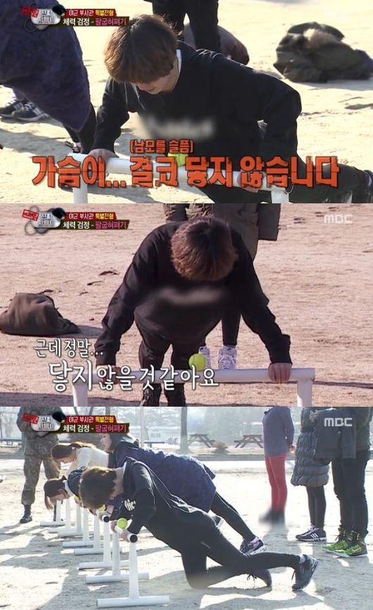 그러나 안영미는 단 한개도 성공하지 못했다. 팔굽혀펴기는 공이 있는 곳까지 몸을 내려 가숨을 닿게 해야하는데 안영미는 이에 성공하지 못했던 것.