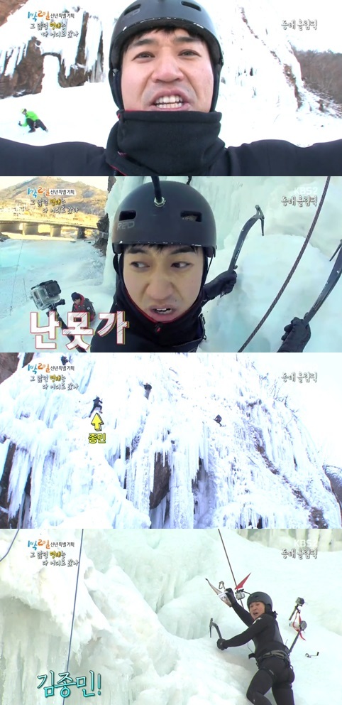 김종민은 25일 오후 방송된 KBS 2TV 예능프로그램 ‘해피선데이-1박2일(이하 ’1박2일‘)’에서 빙벽 도전에 성공해 눈길을 끌었다.