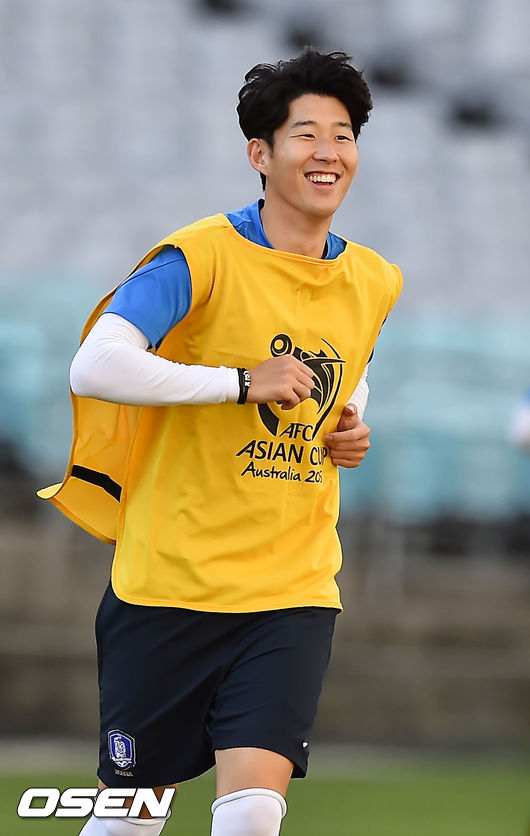 울리 슈틸리케 감독이 이끄는 한국 축구대표팀이 이라크와의 2015 아시안컵 4강전에 대비해 25일 오후 호주 시드니 스타디움 오스트레일리아서 훈련을 가졌다. 훈련 중 손흥민이 환하게 웃고 있다.