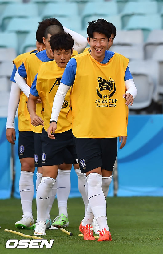 울리 슈틸리케 감독이 이끄는 한국 축구대표팀이 이라크와의 2015 아시안컵 4강전에 대비해 25일 오후 호주 시드니 스타디움 오스트레일리아서 훈련을 가졌다. 그라운드 위에서 손흥민이 훈련을 하며 환하게 웃고 있다.