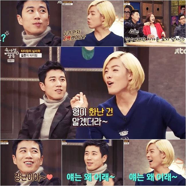 하지만 현재 13살 연하의 여대생과 1년째 열애중인 장수원. 이에 여자 친구를 어디서 만났는지 등의 질문이 쏟아지자 장수원은 빙그레 웃기만 했지만, 강남은 "93년생? 범죄 아니야?"라고 말해 장수원을 발끈하게 만들었다. 급기야 장수원은 "미성년자 아니야"라고 답하며 빠르게 강남의 멱살을 잡아 보는 이들을 폭소케 했다.