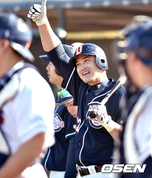 홍성흔이 후배들의 훈련에 엄지 손가락을 들어 보이며 칭찬을 하고 있다./spjj@osen.co.kr
