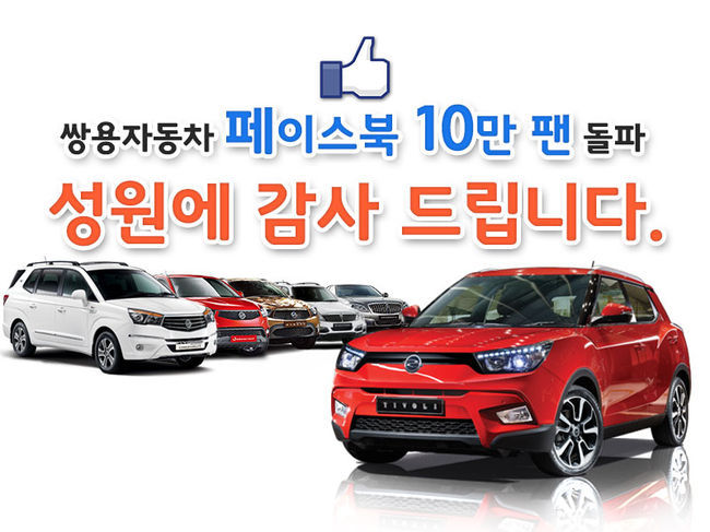 쌍용차의 공식 페이스북의 팬이 계정 오픈 3년 6개월 만에 10만 명을 넘어섰다.
