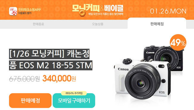 26일에는 1800만 화소, Wi-Fi 기능이 탑재된 ‘캐논 미너리스 EOS M2 18-55 STM’을 판매가에서 50% 할인된 34만 원에 30대 한정 판매한다.