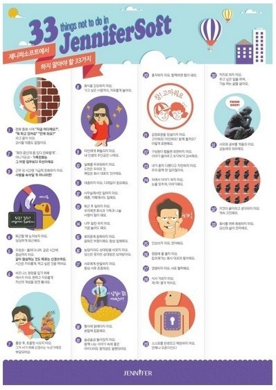 제니퍼소프트의 경영철학을 알 수 있는 '제니퍼소프트에서 하지 말아야 할 33가지'라는 금지조항도 재미있다. '33가지 금지 조항'에는 당연한 것처럼 받아들이고 있던 그 동안의 직장 문화에 정면으로 맞서는 조항들이 줄줄이 나열 돼 있다.
