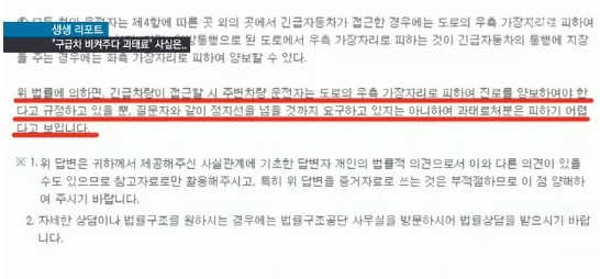 경찰에 해명을 해봐도 어쩔 수 없단 대답만 되돌아왔고, 법률구조공단에 문의해도 대답은 마찬가지였다. 특히 공단 측은 법에 긴급차량 접근할 시 도로 우측으로 피하라고만 돼 있지 정지선을 넘어도 된다곤 안 돼 있다며 범칙금은 피할 수 없다고 설명했다.