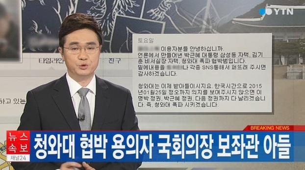 26일 노컷뉴스 YTN 등은 지난 25일 오전 청와대 민원실 ARS에 “청와대를 폭파하겠다”는 메시지를 남긴 용의자가 정의화 국회의장 보좌관 A씨의 아들로 확인됐다고 보도했다.