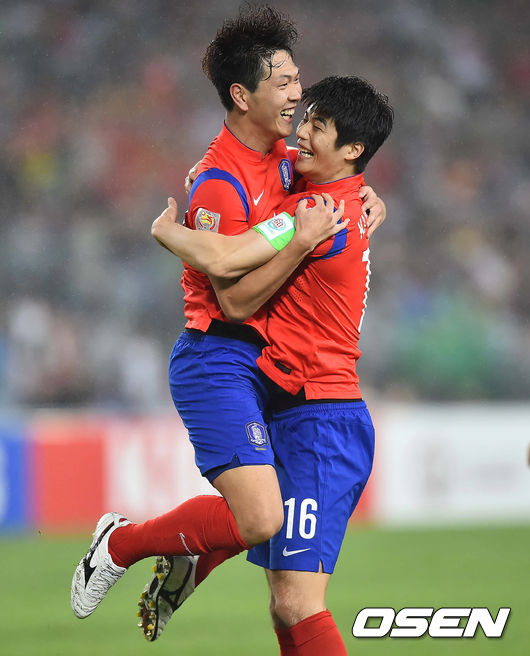 후반 한국 김영권이 추가골을 넣고 기성용과 기뻐하고 있다.