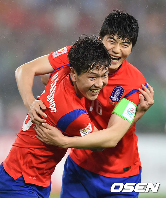 후반 한국 김영권이 추가골을 넣고 기성용과 기뻐하고 있다.