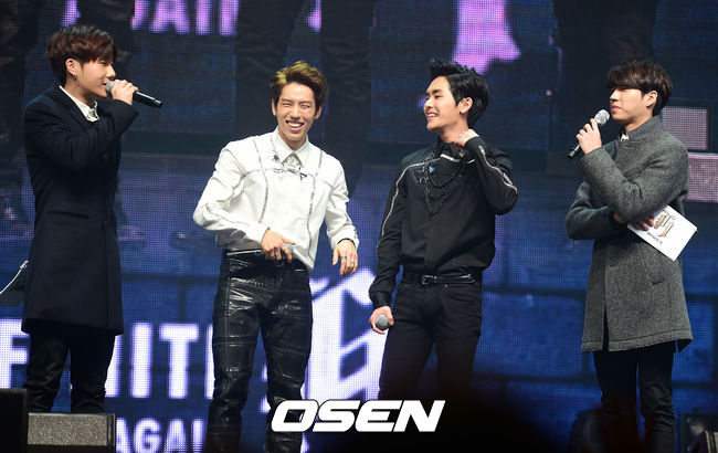 인피니트H가 진행자 성규 우현과 미소짓고 있다.