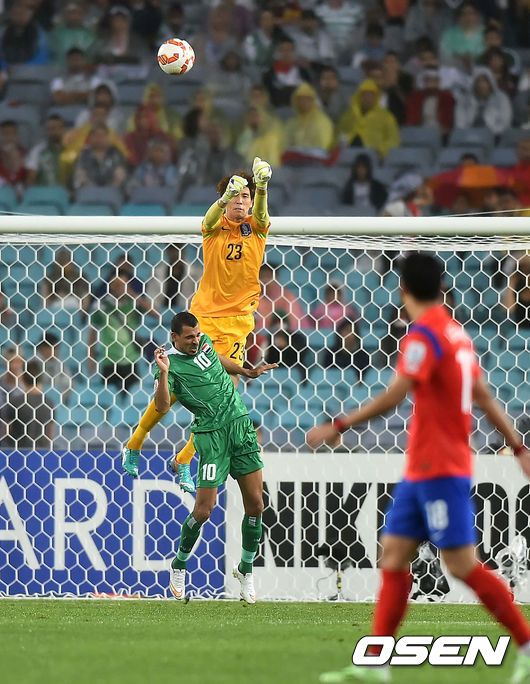 후반 한국 김진현 골키퍼가 이라크 마흐무드에 앞서 공중볼을 처리하고 있다.