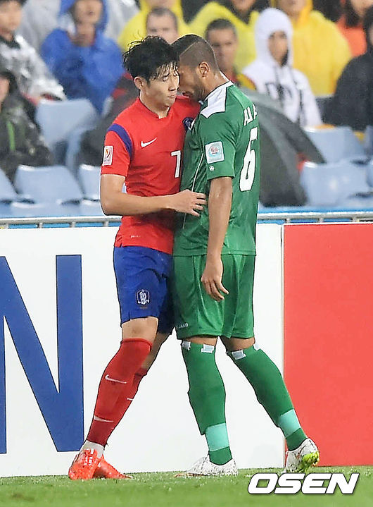 후반 한국 손흥민이 이라크 수비수와 신경전을 벌이고 있다.