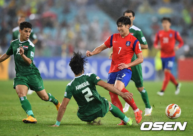 후반 한국 손흥민이 이라크 수비수 태클에 걸리고 있다. / rumi@osen.co.kr