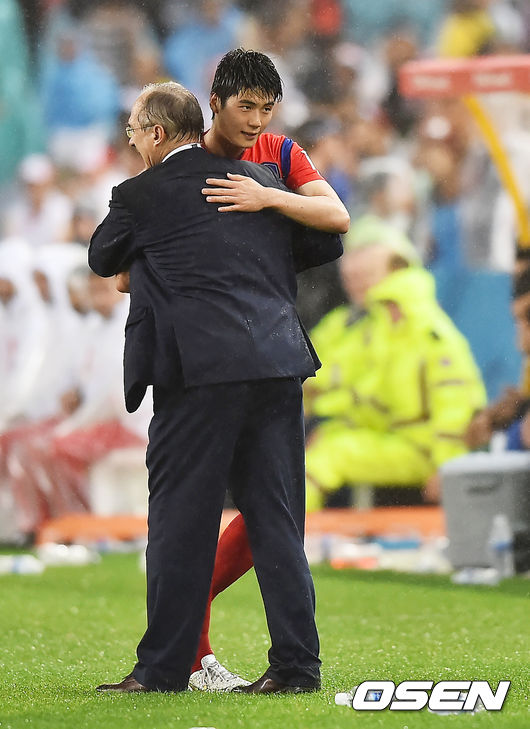 후반 한국 기성용이 교체되며 슈틸리케 감독과 포옹을 하고 있다. / rumi@osen.co.kr