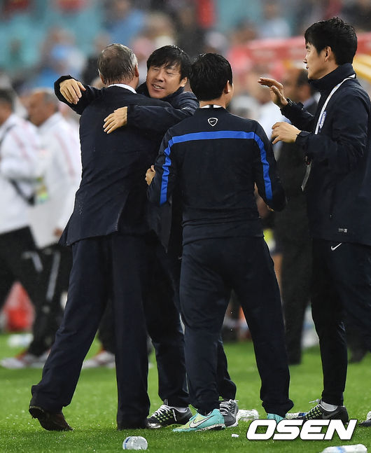 경기후 한국 슈틸리케 감독이 신태용 코치와 승리를 기뻐하고 있다. / rumi@osen.co.kr