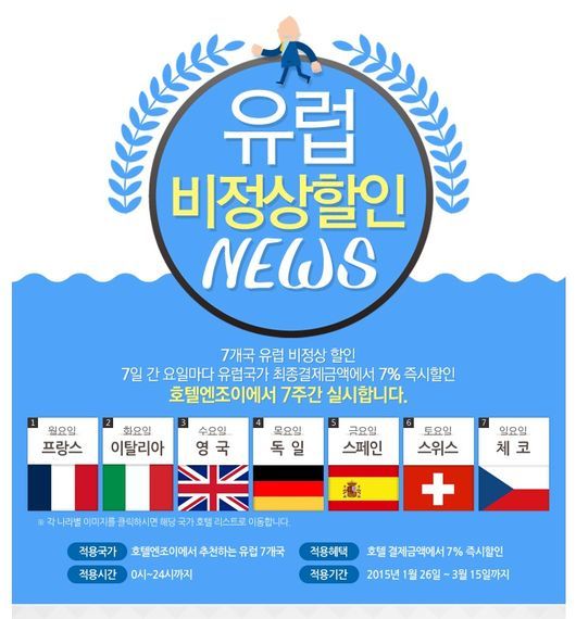 월요일은 프랑스, 화요일은 이탈리아, 수요일은 영국, 목요일은 독일, 금요일은 스페인, 토요일은 스위스, 일요일은 체코 호텔을 예약하는 고객에게 7% 즉시 할인을 제공한다. 상기 프로모션은 호텔엔조이 온라인 웹사이트 뿐 아니라 모바일에서 예약시에도 7%할인이 적용 가능하며, 예약시 호텔 상품 페이지에 '유럽 비정상 할인 7%' 문구를 확인하고 예약하면 할인이 적용된다.