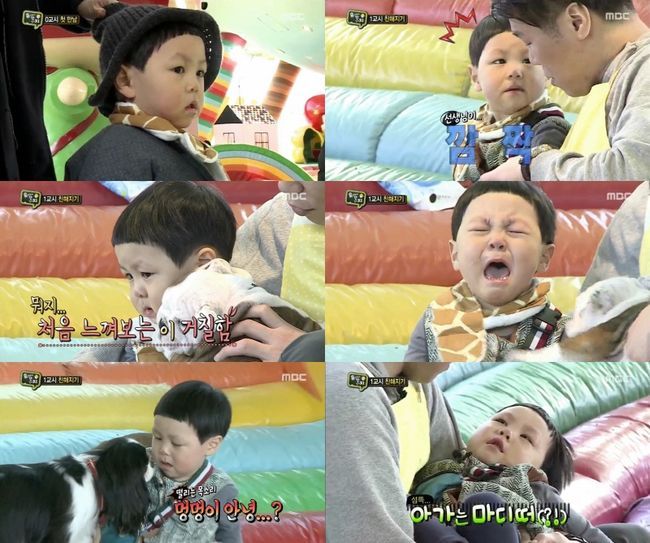 이날 평범하지 않은 유치원에 등원하게 된 윤석이는 서장훈과 함께 처음 강아지와의 포옹을 시도했다. 초 긍정맨답게 ‘네’라는 대답을 연달아 보이던 윤석이는 강아지의 처음 느껴본 거칠한 촉감을 경험하고선 바로 울음을 터뜨렸다.