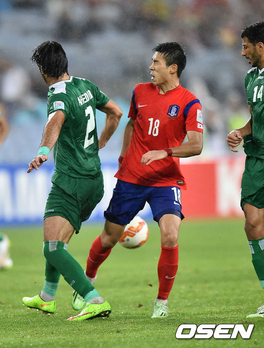 후반 한국 이정협이 볼다툼 중 고통을 호소하고 있다./ rumi@osen.co.kr
