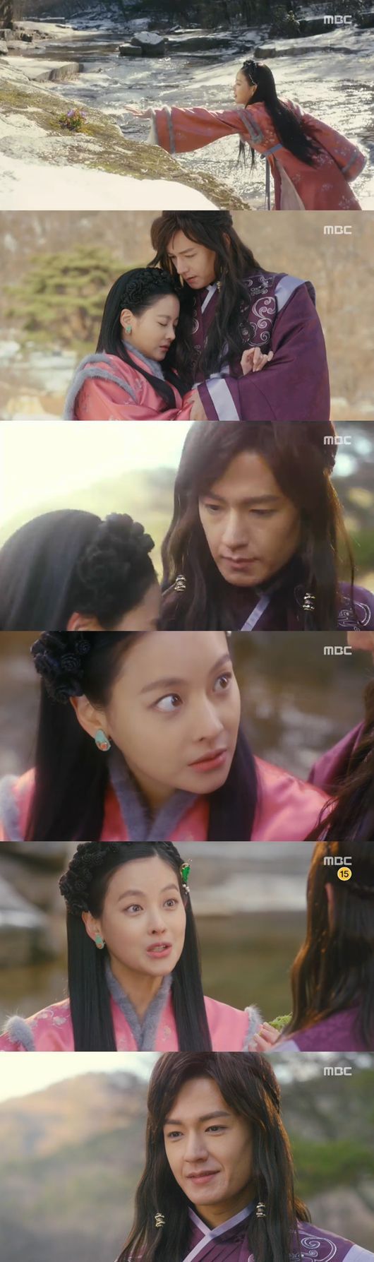 신율은 집으로 돌아가던 중 냇가에서 잠시 쉬었고 이를 왕욱(임주환 분)이 봤다. 신율은 바위 위의 꽃을 따려고 하다 넘어질 뻔 했고 왕욱이 빠르게 다가가 구했다.