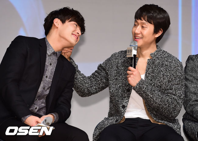 강하늘이 정우에게 애교가 담긴 행동을 하고 있다.