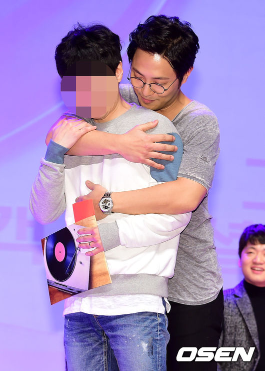 진구가 당첨된 팬에게 백허그를 하고 있다.