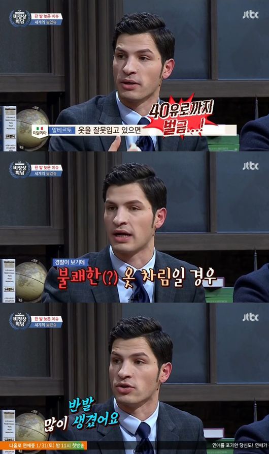 알베르토는 "밀라노에서 패션에 대해 신경 맣이 쓰니까 옷을 잘 못입고 있으면 40유로까지 벌금을 내야 한다"고 말해 놀라움을 자아냈다.