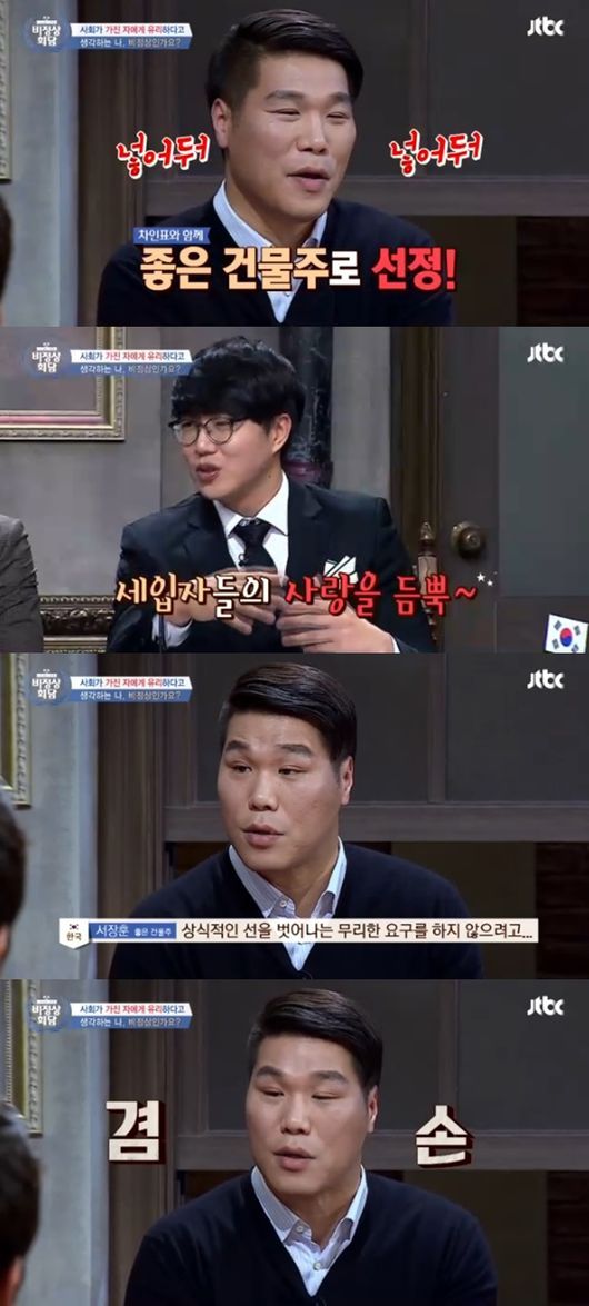 이날 MC들이 서장훈이 차인표와 좋은 건물주로 선정된 것을 언급했다.
